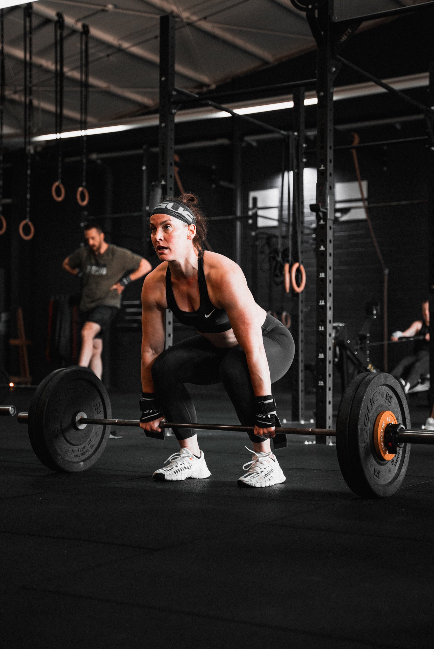 This depends on the league you are participating in. Basically, the following equipment should be available: barbell with weights, dumbbells, kettlebells, rowing machine, assault or echo bike, medicine ball, plyo box, skipping rope, pull-up bar.